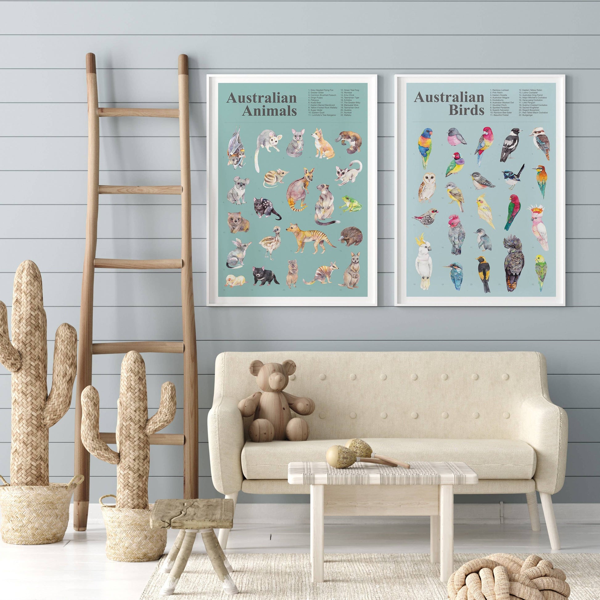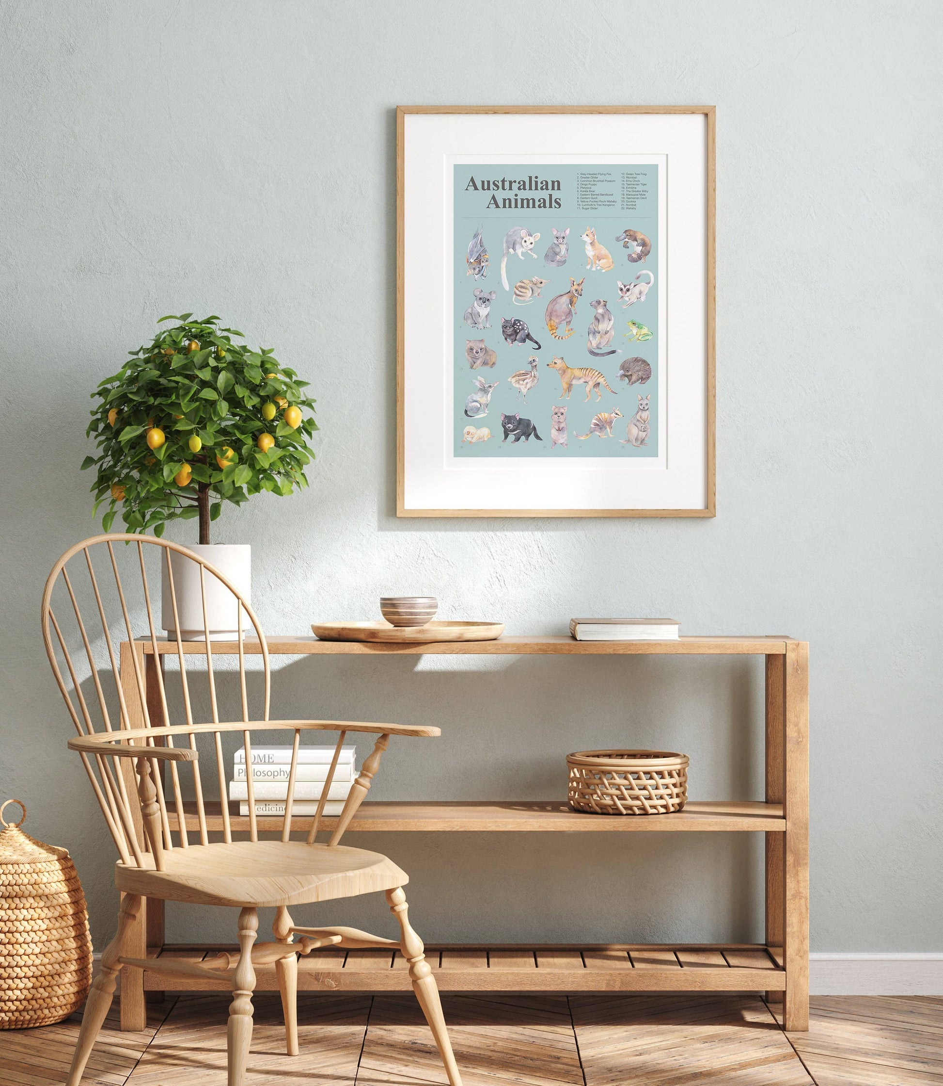 Reproduction of original hand-painted watercolour by Cat Lam, featuring Australian animals with names. Printed on 200gsm recycled paper using vegetable-based inks by an Australian-owned printing company.