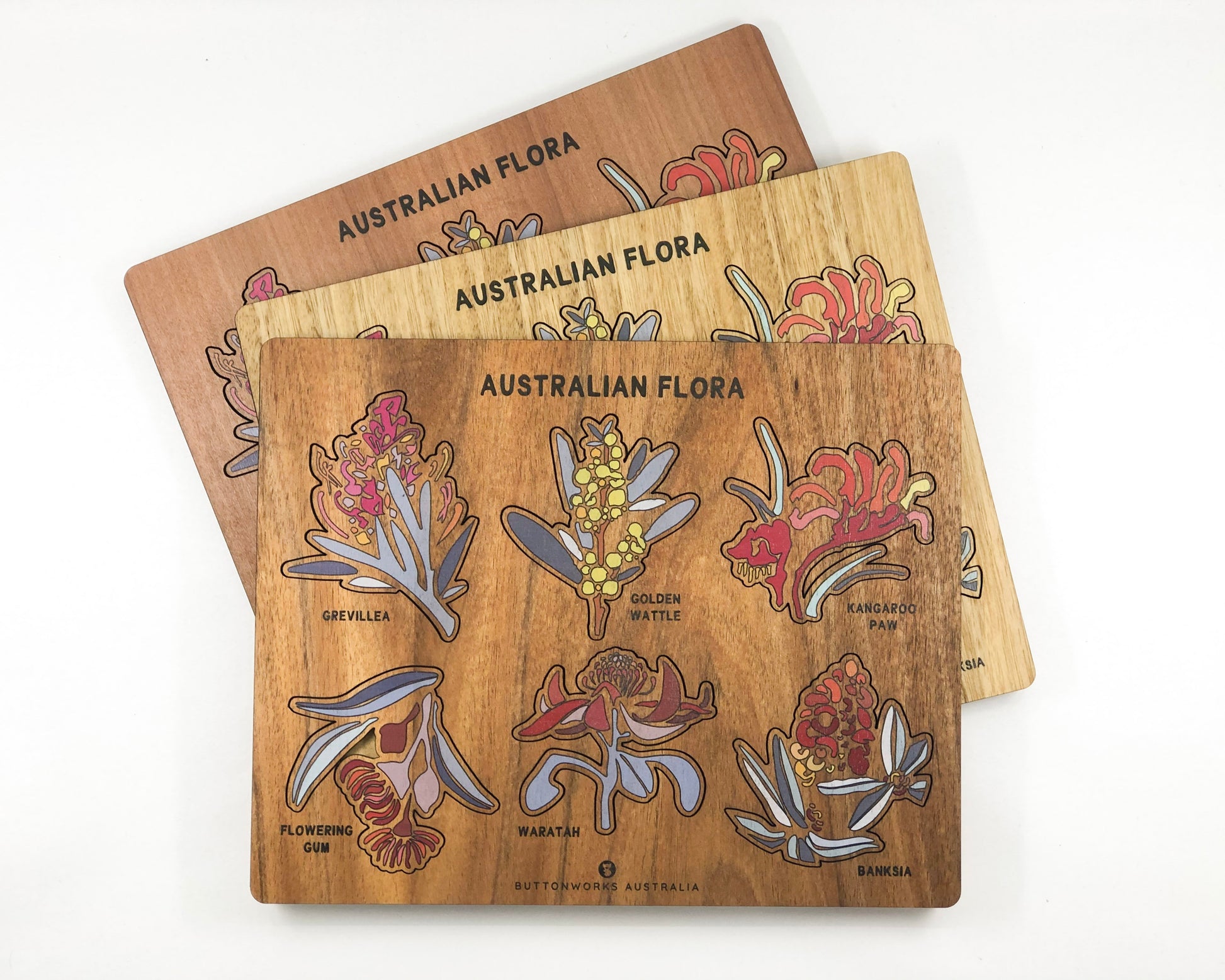 Australian flora puzzle, featuring well known Australian native flora. Lightweight, flat packed and wrapped for easy postage and travelling (size 25cm x 20cm). Each puzzle is made from sustainably sourced Australian timbers, and are available in Myrtle, Blackwood or Tasmanian Oak. Every tree is different, therefore the colour and grain of timber varies, making each of our products unique. The real work has been done by the tree, we have added the craftwork.