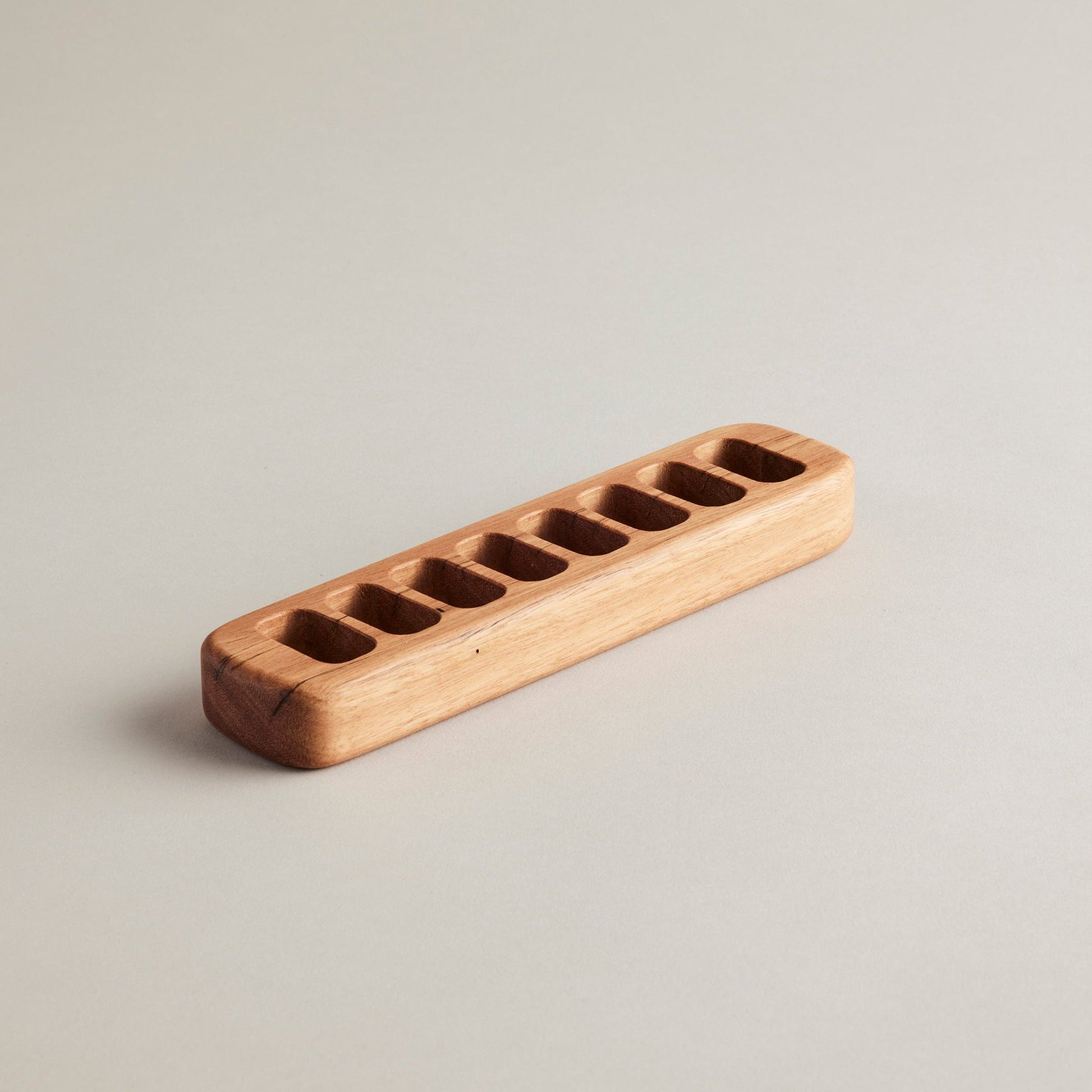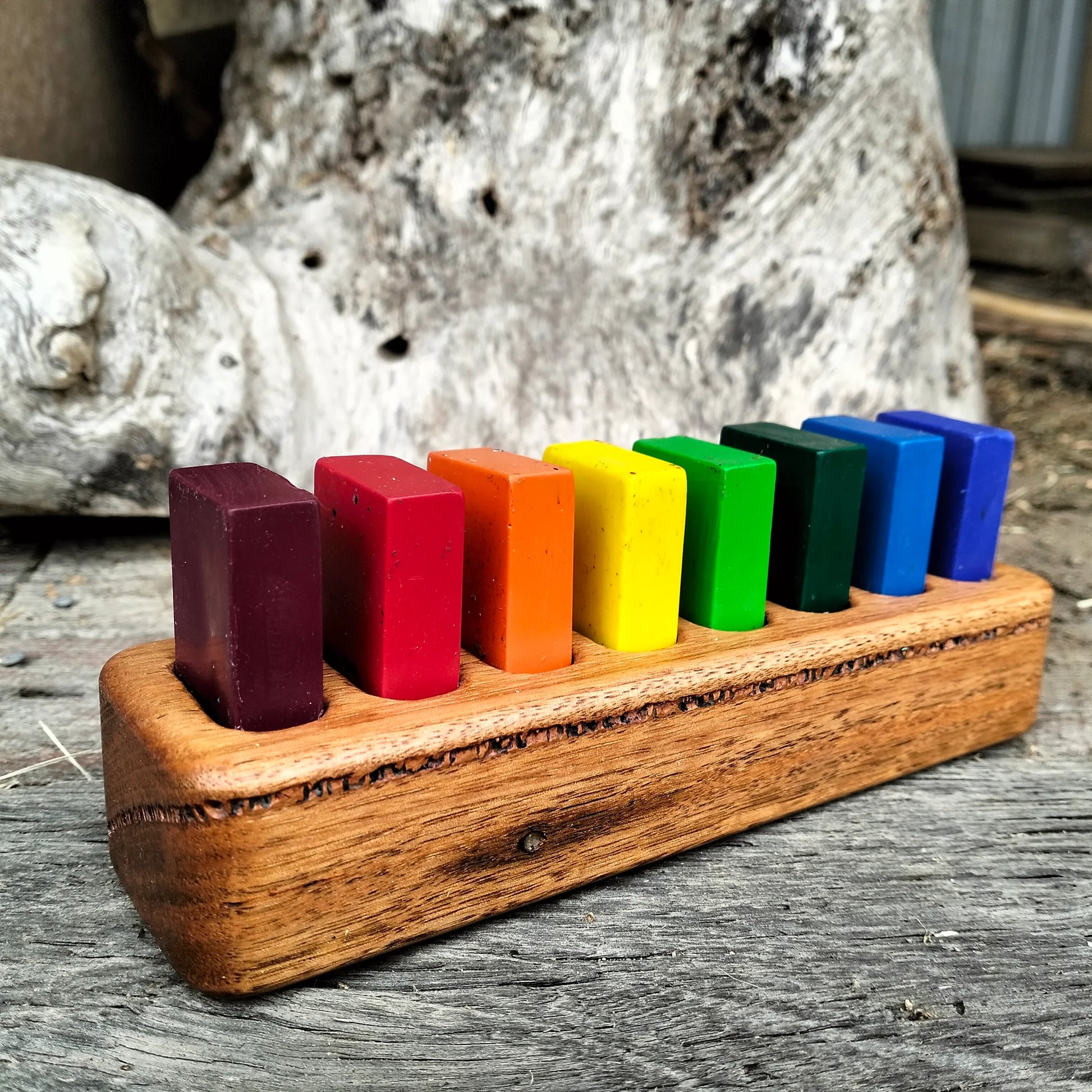 This holder is custom for us from a variety of reclaimed Australian hardwood in The Hunter Valley and has been designed to hold most block crayons, please contact us if you require other sizes. Each is unique.