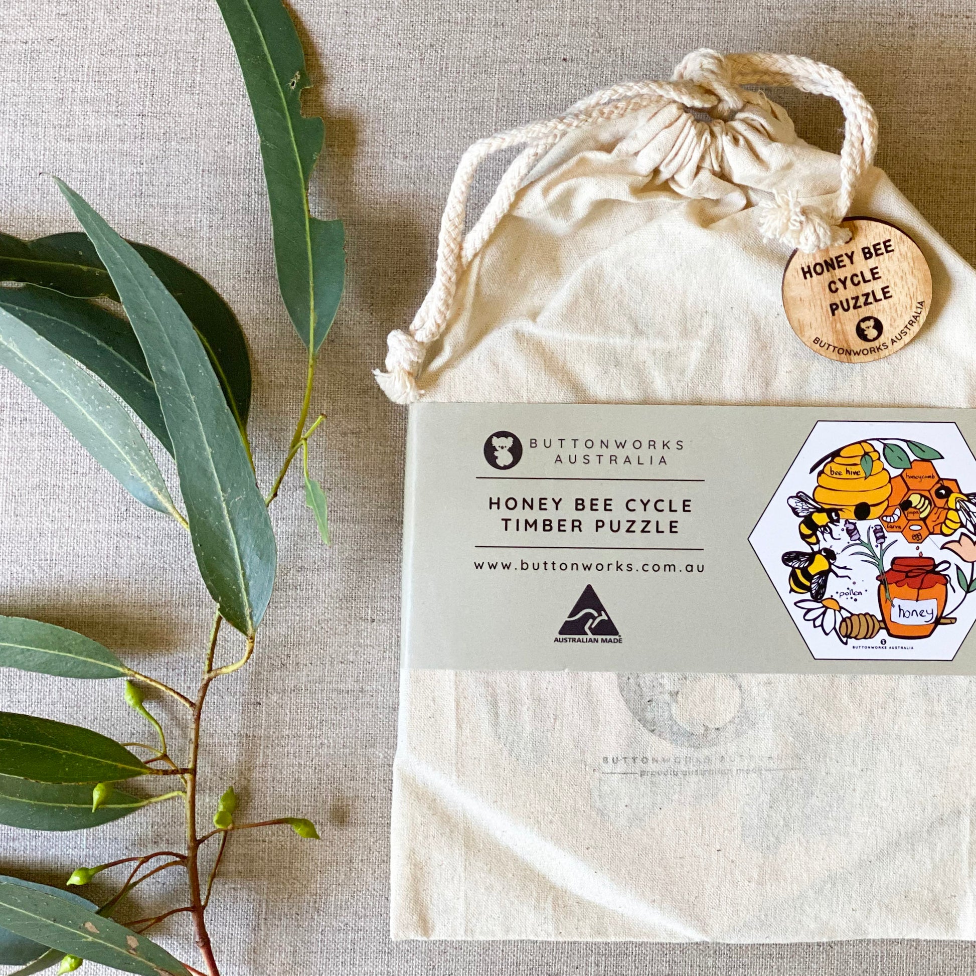 Honey Bee Life Cycle puzzle, features a circular visual story of the life cycle of the bee. Puzzles allow little fingers to develop fine motor skills and little minds to build visual and memory abilities. Lightweight, flat packed and wrapped for easy postage and traveling. Each puzzle is made from sustainably sourced Australian timbers. Every tree is different, therefore the colour and grain of timber varies, making each of our products unique. The real work has been done by the tree, we have added the craftwork.