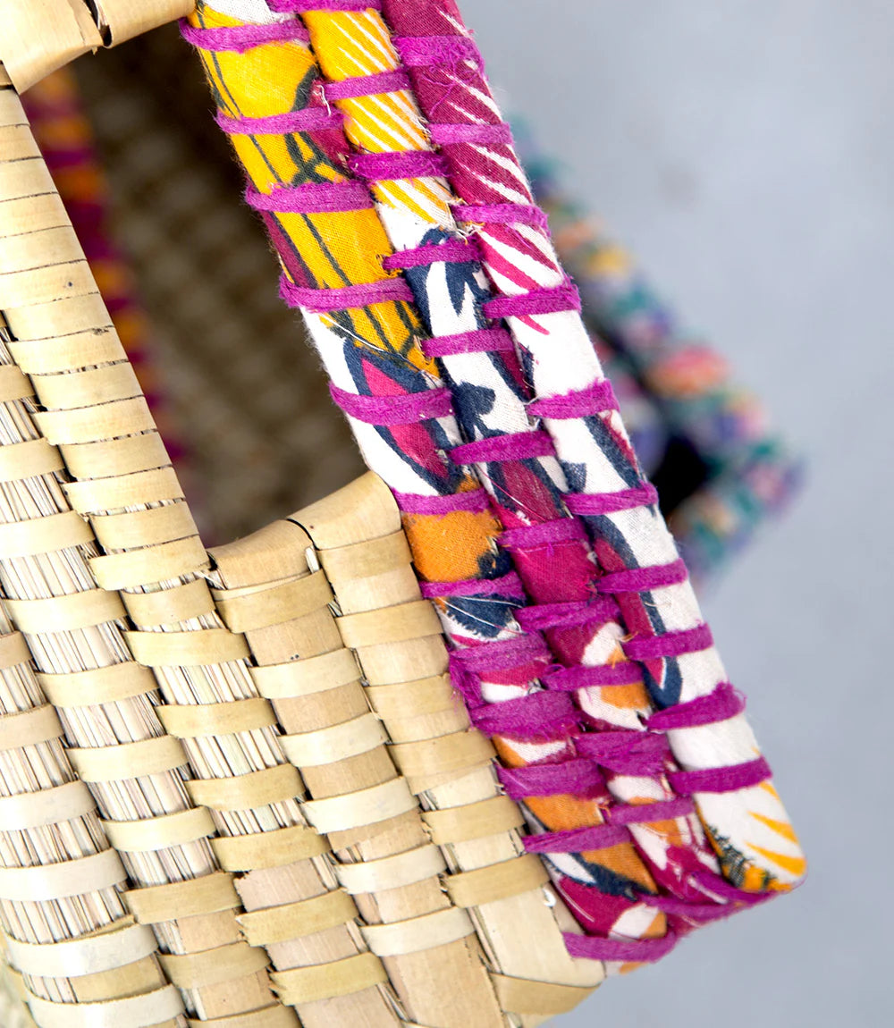 Kaisa is a wild grass that is used in Bangladeshi basket-making. Our baskets also use upcycled sarees from the garment industry. Saree is wrapped around a few coils at the top to finish-off these table baskets.