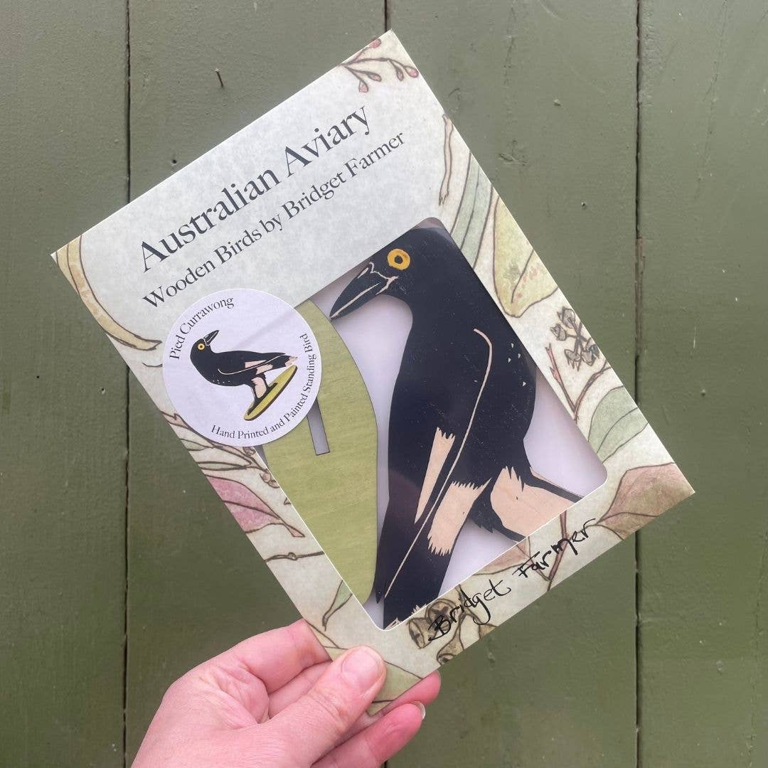 A bold and recognisable figure in both city parks and bushlands, the Pied Currawong is known for its striking black feathers and piercing yellow eye. This wooden standing bird captures that distinctive silhouette in a charming, lightweight decorative piece. From Bridget Farmer’s original linocut design, each bird is hand-printed by studio assistant Sarah and hand-painted.