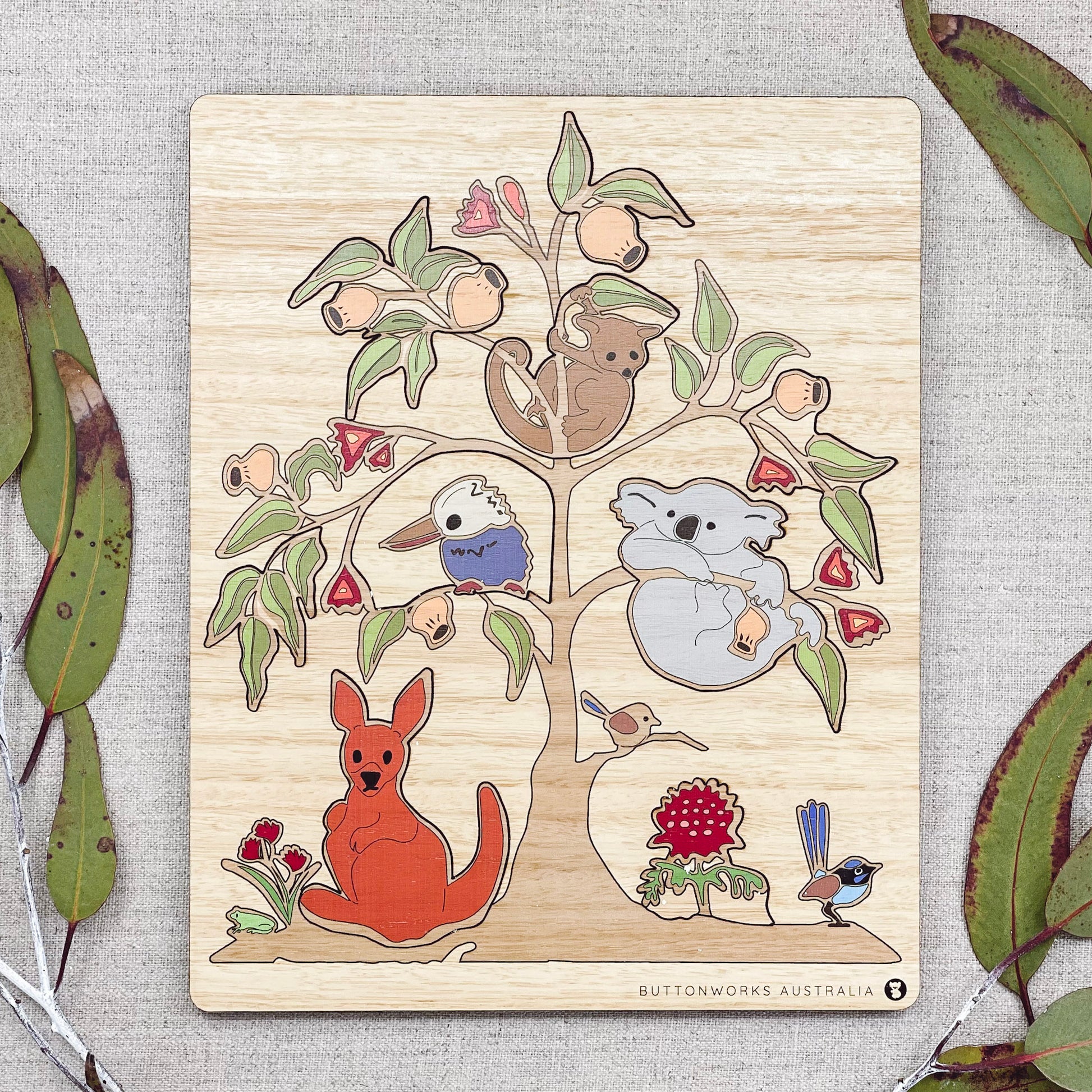 Australian Gum Tree featuring beloved native Australian animals and birds. Lightweight, flat packed and wrapped for easy traveling (size 20cm x 25cm). Every tree is different, therefore the colour and grain of timber varies, making each of our products unique. The real work has been done by the tree, Buttonworks have added the craftwork.